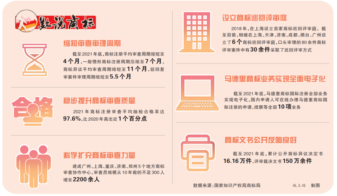 (文章来源:中国知识产权报 原标题:国家知识产权局商标局深入推进商标领域改革取得显著成效——砥砺前行稳主业 提质增效促发展)